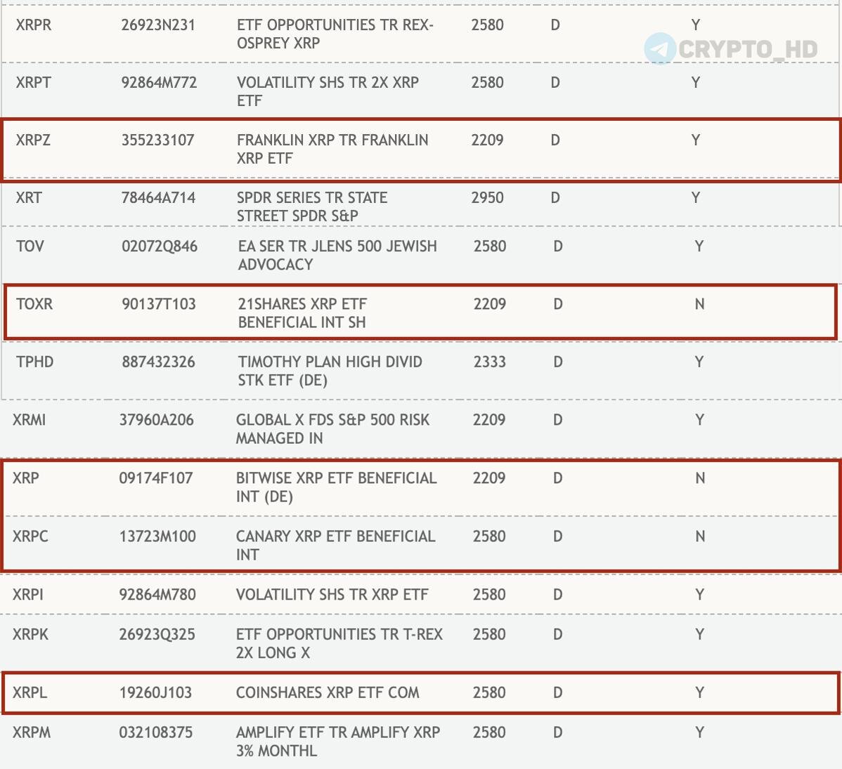 🔥 Тикеры пяти спотовых Ripple ETF появились на сайте DTCC – смотреть ⊹ Franklin XRP Trust (#XRPZ). ⊹ 21Shares XRP ETF (#TOXR). ⊹ Bitwise XRP ETF (#XRP). ⊹ Canary XRP ETF (#XRPC). ⊹ CoinShares XRP ETF (#XRPL). Добавление тикера на сайт DTCC – часть процесса вывода ETF на рынок. Список DTCC включает в себя активные и потенциальные ETF, нет 100% вероятности листинга. Depository Trust & Clearing Corporation занимается клирингом сделок на Nasdaq. Crypto Headlines