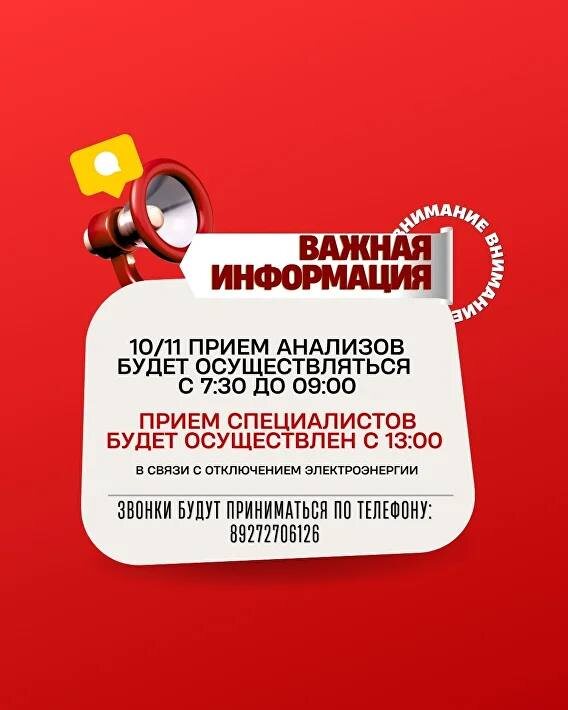 Уважаемые посетители, напоминаем, что сегодня у нас изменения в работе, в связи с отключением электричества. Прием анализов с 7:30 до 9:00 Прием специалистов с 13:00. Сама клиника будет открыта. Прием звонков временно по номеру: +7 927 270 61 26