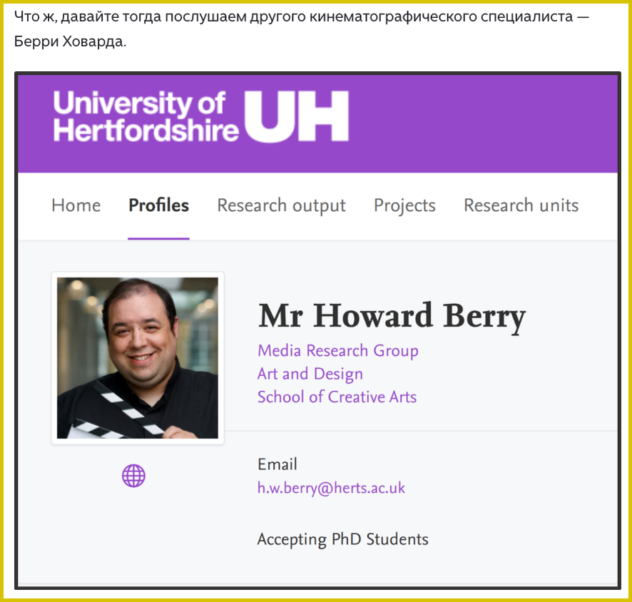 Поскольку лунную аферу я разбираю с точки зрения кинооператора и показываю, что всё пребывание астронавтов на Луне снято в павильоне методом комбинированных кадров, то мне, как бы в противовес, недавно привели высказывание кинематографиста из Великобритании, Ховарда Берри, который, в отличие от меня, считает, что лунные кадры, и в частности, прямой эфир с Луны, невозможно подделать в студии.