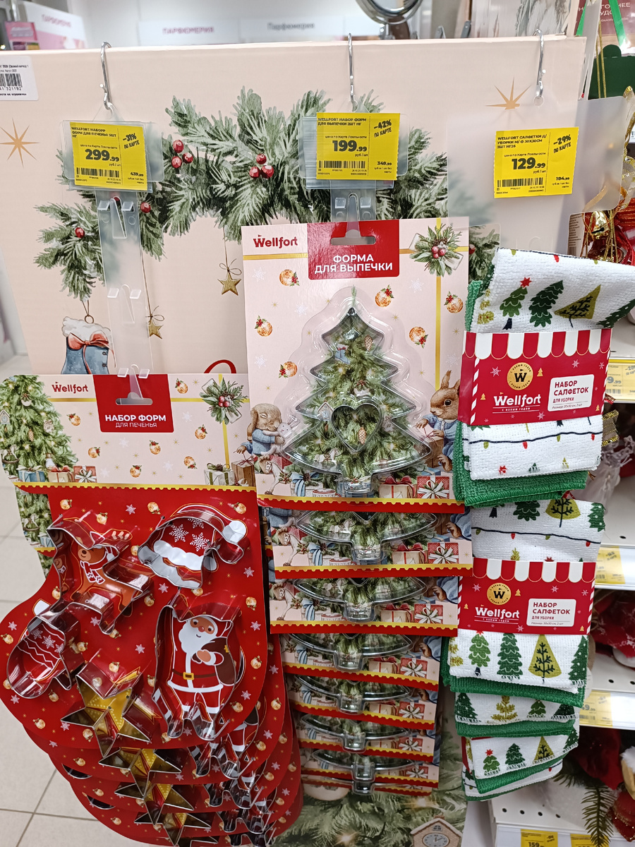 Приветствую! Вот и Магнит выставил секции с новогодними товарами. Чуть раньше делала обзор новогодней посуды и прочих товаров из Пятерочки, можете на канале посмотреть. Я постараюсь показать не растягивая, первым стойку с товарами для кухни. Формы для выпечки, салфетки игрушки общим планом, мне кажется, их и так везде полно. Маски понравились, очень хочется себе черную! Примеряла похожие в Фикс Прайсе и даже сфотографировалась, мне идет. они очень элегантные, выглядят, как кружевная ткань. цена: Трубочки, всякие наконечники для кулинарных шприцов и открывашки. А вот эти кружки очень понравились! красная и зеленая - самые смаковые цвета каждого Нового года! полностью в одном цвете. Рисунки на них разные. На этикетке написано, что эти кружки фарфоровые. Хотя стенки достаточно толстые. Там просто белые кружки с белками и подарками тоже есть. и кружки двухстеночные из стекла, внутри блестки. Все на полке с ценниками. еще белая фарфоровая: ценник на них: Салатники маленькие, тоже с ново