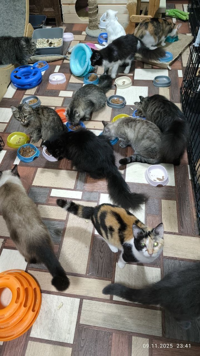 Вечернее (практически ночное.. есть время съёмки) кормление одной из комнат💖 Трёшка смотрит в камеру. Вдалеке вижу Белкунью) Корма, друзья, ежедневно уходит очень и очень много, ведь хвостиков 200+.. уходит и влажный корм и сухой.. некоторые хвостики едят по несколько пакетиков, одним не наедаются.. ( Жорик, Лунтик итд) Есть те, которые едят только Тему...поэтому сбор на корм очень и очень важен. Мы не можем допустить голода у тех, кого спасали от верной смерти на улицах, от усыпления в клиниках итд.....
