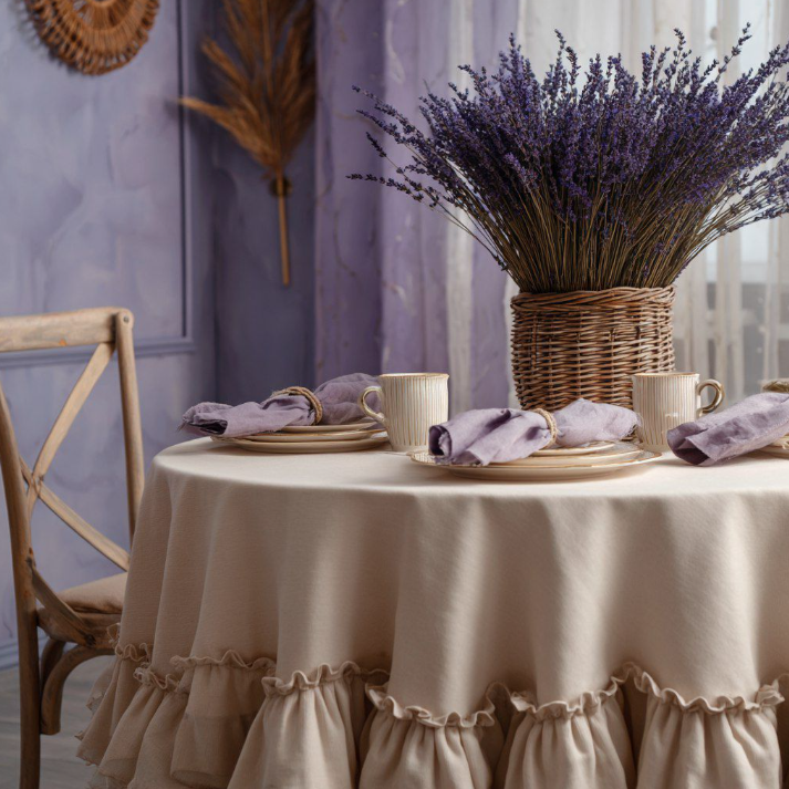 Также увидим деликатные рюши и мини-оборки – они особенно мило смотрятся на маленьких круглых столиках для завтрака на балконе или в эркере. Очень практичный тренд – двусторонние (реверсивные) скатерти: одна сторона спокойная, нейтральная, другая – с легким принтом. Перевернул – и получил новое настроение без лишних трат! Для семей с детьми или любителей ягодных смузи актуальны скатерти с матовыми эко-покрытиями нового поколения, устойчивыми к пятнам, но без неприятной "пластиковой" текстуры.