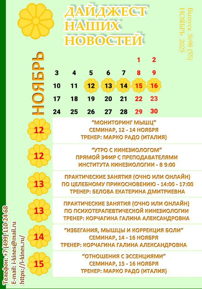 ✅ 12 ноября - «Мониторинг мышц» ✅ 12 ноября - Утро с кинезиологом! ✅ 13 ноября - Практическое занятие по Целебному прикосновению ✅ 13 ноября - Практическое занятие по Психотерапевтической кинезиологии (2-3 КУРС) ✅ 14 ноября - «Избегания, мышцы и коррекция боли» ✅ 15 ноября - «Отношения с эссенциями» 🔴🔴>>>НАШ САЙТ<<<🔴🔴 👉ОТЗЫВЫ О НАШЕЙ РАБОТЕ В ТГ👈 👉ОТЗЫВЫ О НАШЕЙ РАБОТЕ НА RUTUBE👈