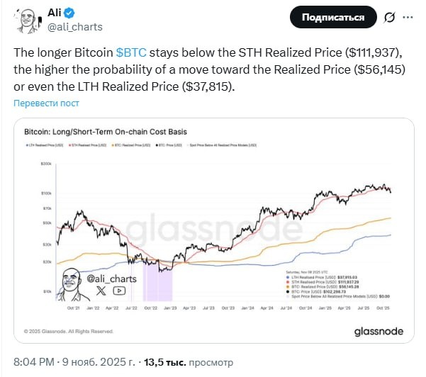 Чем дольше биткоин остается ниже Цены Реализации Краткосрочных Холдеров ($111 937), тем выше вероятность движения к Цене Реализации ($56 145) или даже к Цене Реализации Долгосрочных Холдеров ($37 815).