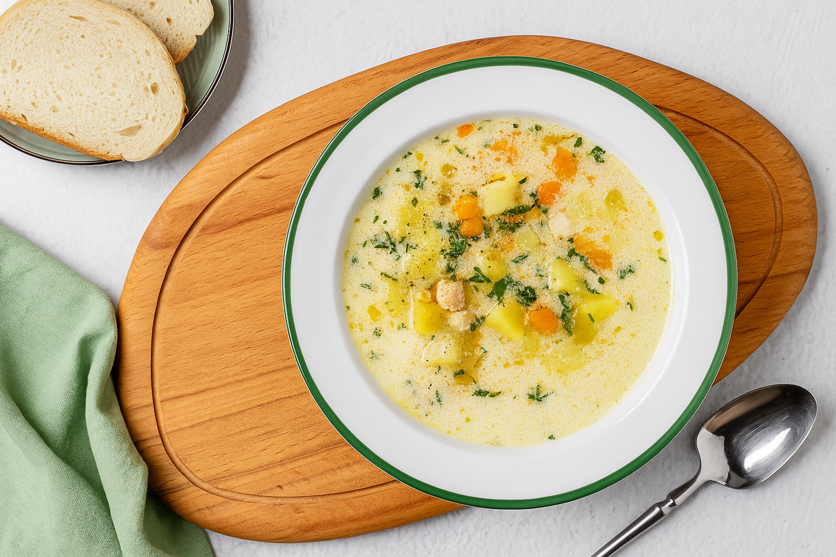 Сырный суп на плавленых сырках — это такая уютная тарелка тепла, от которой сложно отказаться. А если в дело вступают копчености, то суп превращается в настоящий ароматный хит: легкая кремовая текстура, сливочный вкус и мягкий «дымок» от курицы.