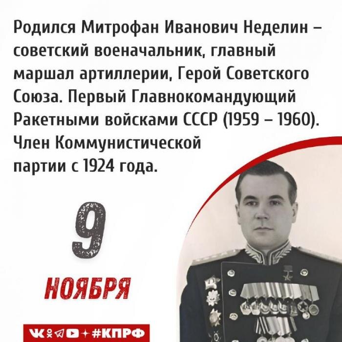 9 ноября 1902 года – родился Митрофан Иванович Неделин – советский военачальник, главный маршал артиллерии, Герой Советского Союза. Первый Главнокомандующий Ракетными войсками СССР (1959 – 1960). Член Коммунистической партии с 1924 года. Митрофан Иванович Неделин родился 9 ноября 1902 года. Учился в Липецком реальном училище, а после 1917 года начал работать в железнодорожных мастерских и посещать вечернюю школу. В 1920 году добровольцем вступил в ряды РККА и самостоятельно начал изучать артиллерийское дело. Участвовал в боях с польскими войсками, боролся с бандитизмом и басмачеством. В 1923 году по состоянию здоровья был уволен в запас. В 1924 году Неделин вступил в Коммунистическую партию и вернулся в строй. Окончил артиллерийские курсы усовершенствования комсостава (1929 и 1934 годы) и академические курсы усовершенствования комсостава (1941 год). Служил командиром артиллерийской батареи, командиром дивизиона, начальником штаба артиллерийского полка. Добровольцем участвовал в боях с
