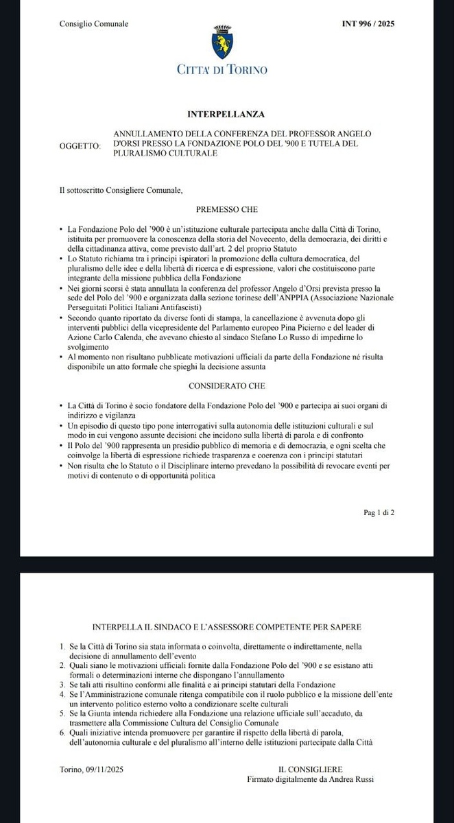 Interpellanza del consigliere comunale Andrea Russi in merito all'annullamento della Conferenza del Prof. Angelo d'Orsi al Polo del '900 e se si ritiene possibile che politici europei o nazionali possano influenzare le decisioni della Fondazione Polo del '900 Chiunque volesse chiedere informazioni al sindaco di Torino Stefano Lo Russo (non siamo parenti) può inviare una email a sindaco.lorusso@comune.torino.it 😊Vincenzo Lorusso 👍 Giornalista 🤩 🇷🇺 Autore 📱 Donbass Italia 👉