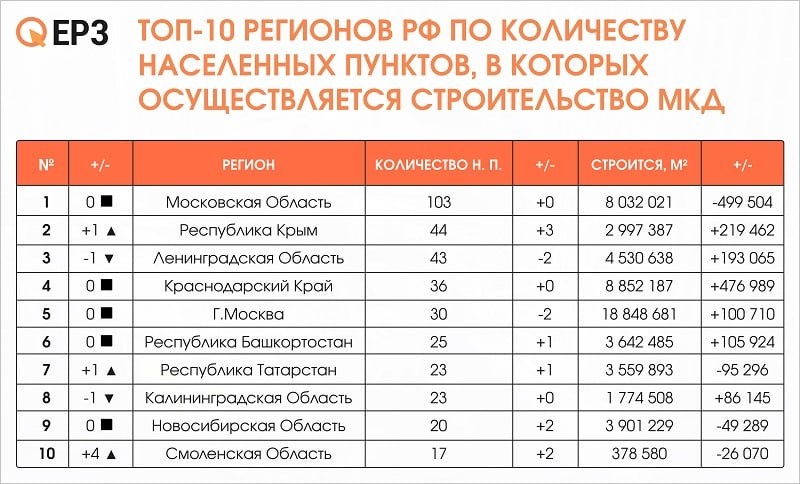Республика вошла в тройку регионов с наибольшим количеством населённых пунктов, где строятся МКД. Лидером по числу населённых пунктов с новостройками остаётся Московская область — строительство ведётся в 103 локациях, общий объём жилья — 8 млн м². Крым впервые занял второе место — в 44 населённых пунктах возводится почти 3 млн м². В десятку также вошла Смоленская область, а из неё выбыла Свердловская.