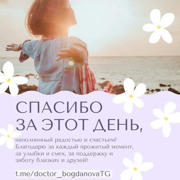 ☀️ Техника благодарности: как наполнить жизнь светом? 🙏 🌟 Благодарность — не просто вежливость, а мощный инструмент для психики. ✅ Как практиковать? 1. Конкретика: Не «спасибо за всё», а «благодарю за поддержку подруги сегодня». 2. Регулярность: Выделяйте 2 минуты вечером, чтобы письменно отметить 3 хороших момента дня. 3. Принимать уроки: Даже в сложных ситуациях находите повод сказать «спасибо» за опыт. ✅ Польза? Снижает тревогу, улучшает сон, учит видеть хорошее даже в мелочах. Это не отрицает трудности, но помогает переключить фокус на ресурсы. ✨ Попробуйте неделю вести «дневник благодарности» — изменения вас удивят! С заботой о вашем здоровье, доктор Богданова ❤️ 💫 P.S. Ваше сердце и разум достойны доброты — начните с благодарности себе 🙏