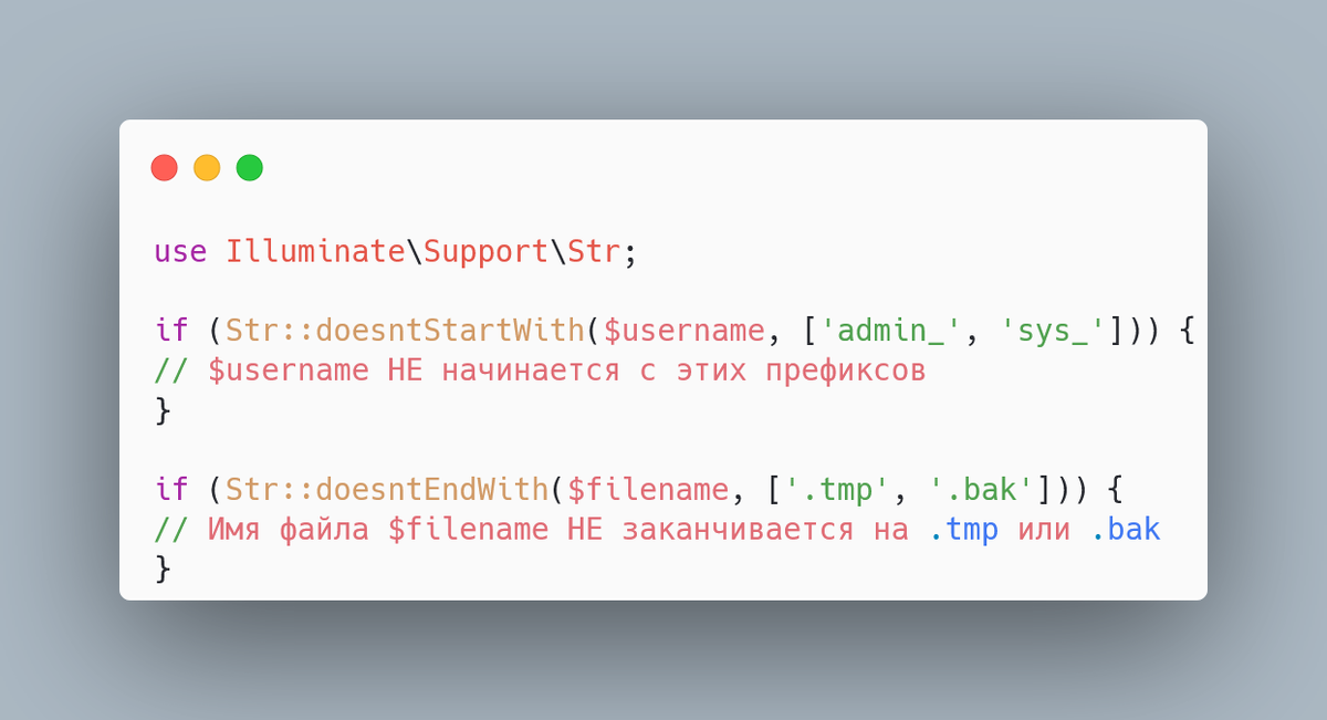 🚀 Laravel: Str::doesntStartWith() и Str::doesntEndWith() — более чистые проверки строк на отрицательные условия