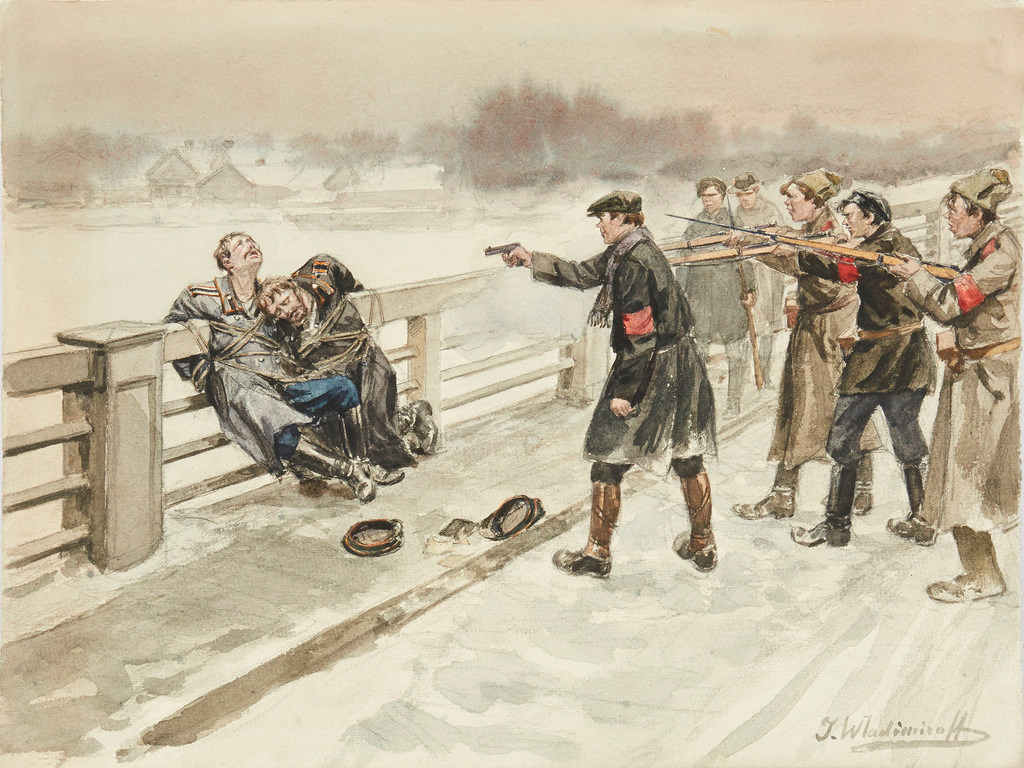 Как только рабоче-крестьянские массы под руководством большевиков взяли власть в октябре 1917-го, против новой власти началась ожесточенная борьба. Борьба велась штыком, пером и кистью. И вот, когда Советский Союз был разрушен внезапно выяснилось, что одной из этих "кистей" оказался... заслуженный советский художник-баталист Иван Алексеевич Владимиров (1869-1947), известный картинами на революционно-военные сюжеты. В 90-е годы были обнародованы так называемые "революционные акварели" - серия акварельных набросков, где показана "страшная правда" о революции и "зверства большевиков":