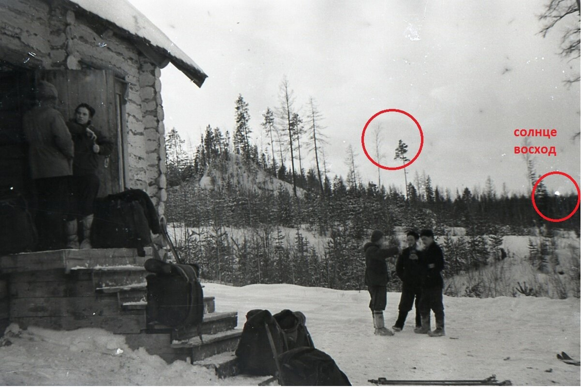 Азимут – 218.47 градусов, время – 15:56 дня. Практически в 4 часа дня/вечера. По записям в дневниках в это время дятловцы уже двинулись в поход из посёлка 41-ый Квартал, но на фотографии «У крыльца» нет предпосылок к отправке. Ведь необходимо было ещё «Свистать всех наверх!», собраться, распрощаться с лесорубами. Сколько потребовалось бы времени, неизвестно, но явно не 4 минуты.
