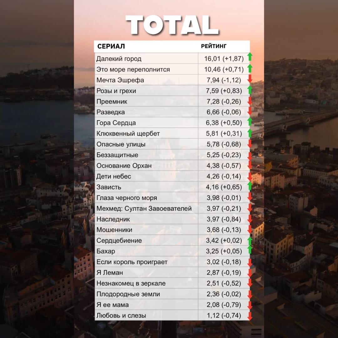 Прошедшая неделя в мире турецких сериалов оказалась настоящим калейдоскопом эмоций: от уверенного лидерства до внезапных падений и сюрпризов, которые держали зрителей в напряжении. Давайте разберемся, что произошло в рейтингах с 3 по 9 ноября, опираясь на данные из различных категорий. Эта неделя показала, насколько непредсказуема борьба за внимание аудитории, и стала очередным подтверждением того, что в турецком сериальном мире нет места скуке. 🏙️ «Далекий город» продолжает доминировать, удерживая первое место во всех трех категориях. После небольшого спада на предыдущей неделе сценаристы, видимо, учли уроки и вернули сериал на вершину. Зрители, похоже, вновь в восторге от интриг и драмы, которые разворачиваются в этом урбанистическом шедевре. 🌊 «Это море переполнится» не сбавляет темп и прочно обосновалось на второй позиции. История о турецкой глубинке, полной страстей и конфликтов, явно зацепила аудиторию. Рост рейтингов говорит о том, что сериал нашел свою нишу и продолжает радо