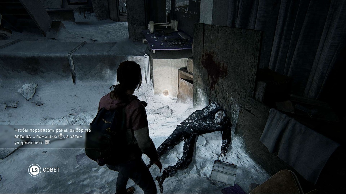 Игра проходит в промежутке между тем как я закончил смотреть сериал повторно и по событиям в самой игре после того как Джойла ранили охотники и он упал с лошади и началась зима. ❄️ Играем за персонажа Элли. Девчонка спрятала Раненого Джойла напоровшеся на штырь арматуры в магазинчике заброшенного Торгового центра Колорадо плаза. Зря я не запомнил где конкретно и название магазинчика , потом нашёл только посмотрев видео мужичка прохождение игры в ютубе потеряв полчаса времени не понимая куда нужно доставить найденные лекарства. В аптеке лекарства я не нашёл и увидев сбитый вертолёт нужно было как то туда добраться через полчища зомби. 🧟