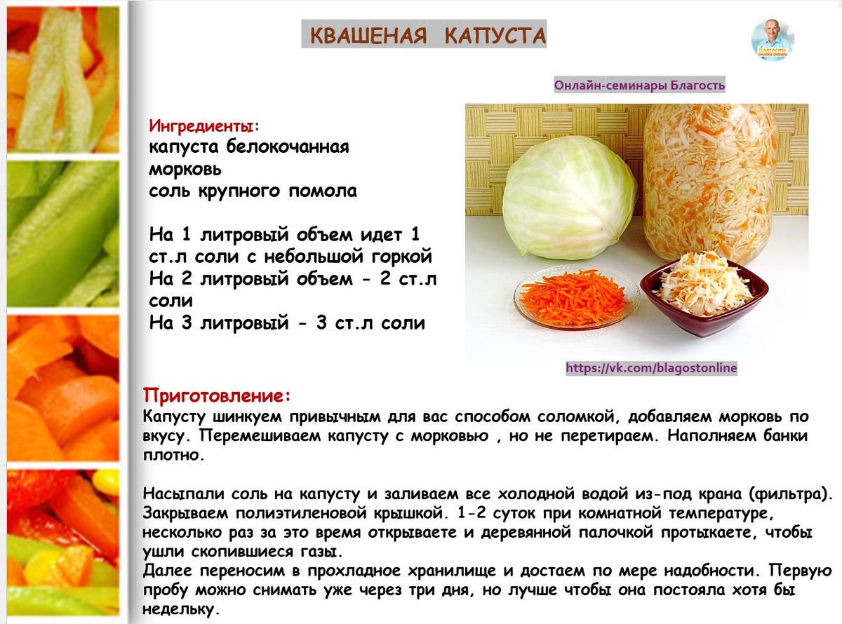 🥬 КВАШЕНАЯ КАПУСТА 🌀 Ингредиенты: капуста белокочанная морковь соль крупного помола На 1 литровый объем идет 1 ст.л соли с небольшой горкой На 2 литровый объем - 2 ст.л соли На 3 литровый - 3 ст.л соли 🌀 Приготовление: Капусту шинкуем привычным для вас способом соломкой, добавляем морковь по вкусу. Перемешиваем капусту с морковью , но не перетираем. Наполняем банки плотно. Насыпали соль на капусту и заливаем все холодной водой из-под крана (фильтра). Закрываем полиэтиленовой крышкой. 1-2 суток при комнатной температуре, несколько раз за это время открываете и деревянной палочкой протыкаете, чтобы ушли скопившиеся газы. Далее переносим в прохладное хранилище и достаем по мере надобности. Первую пробу можно снимать уже через три дня, но лучше чтобы она постояла хотя бы недельку.