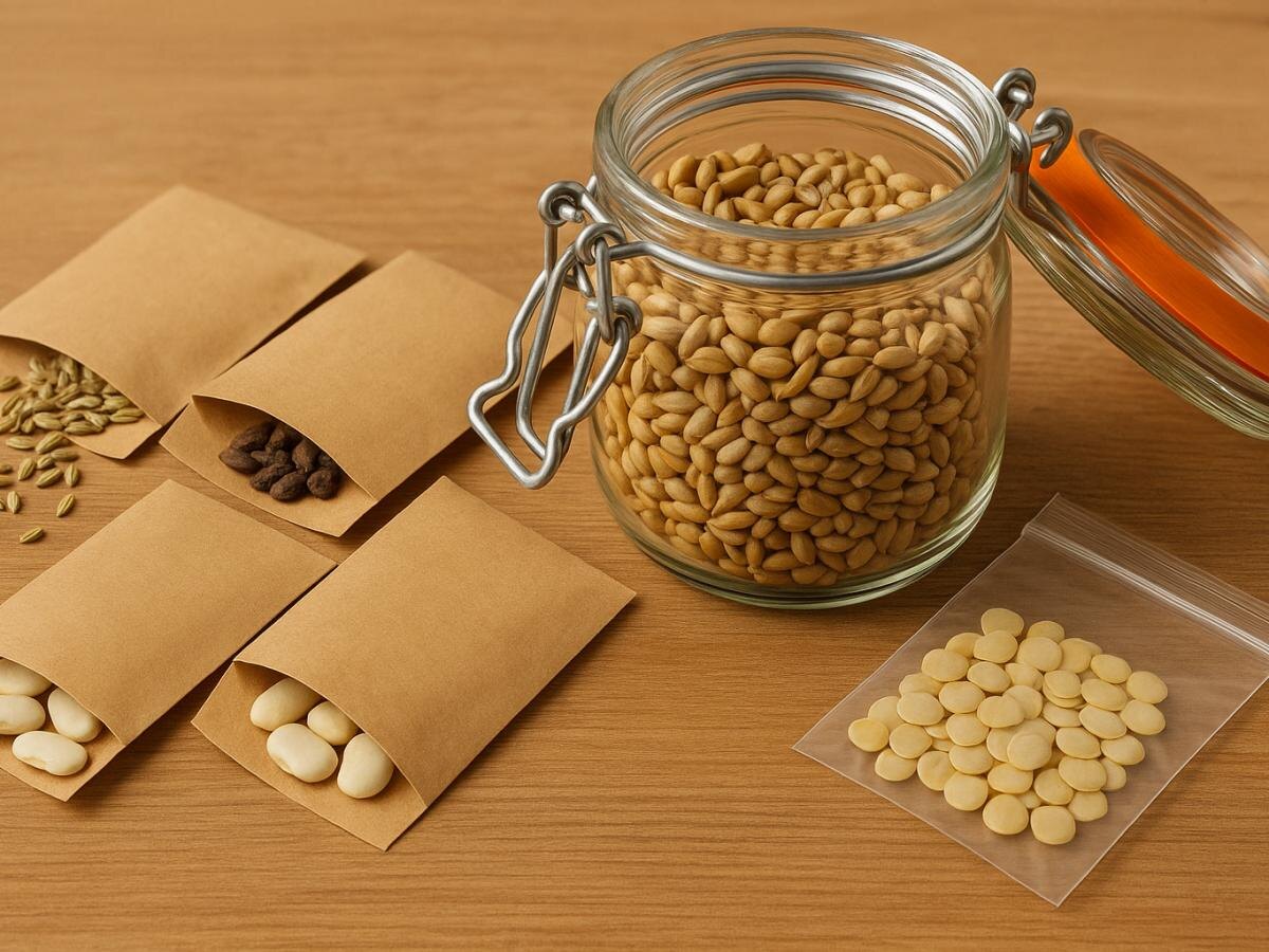 - Ошибка: хранение в пластике.Последствие: конденсат, плесень, потеря всхожести.Альтернатива: бумажные пакеты или стекло с плотной крышкой.