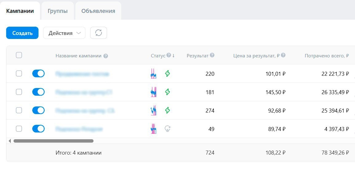 📊 78.000 ₽ — это не "потрачено". Это система, которая приводит заявки. На скриншоте — 4 активные кампании. Общий результат — 724 целевых действия, в среднем по 108 ₽ за заявку. ❌ Без “волшебных кнопок” ❌ Без “залетело случайно” ✅ Только ручная настройка, тесты, анализ, креативы, доработка аудиторий. Каждое объявление здесь — результат десятков итераций. Если в одной кампании 220 заявок, это не «повезло» — это метод. Если вы хотите понять, что у вас не работает — и как это исправить, напишите в личку https://vk.me/kirilldigital — Разбор. Покажу, где теряются деньги, и как сделать рекламу, которая действительно приводит клиентов. Без воды. С цифрами. На вашем примере.