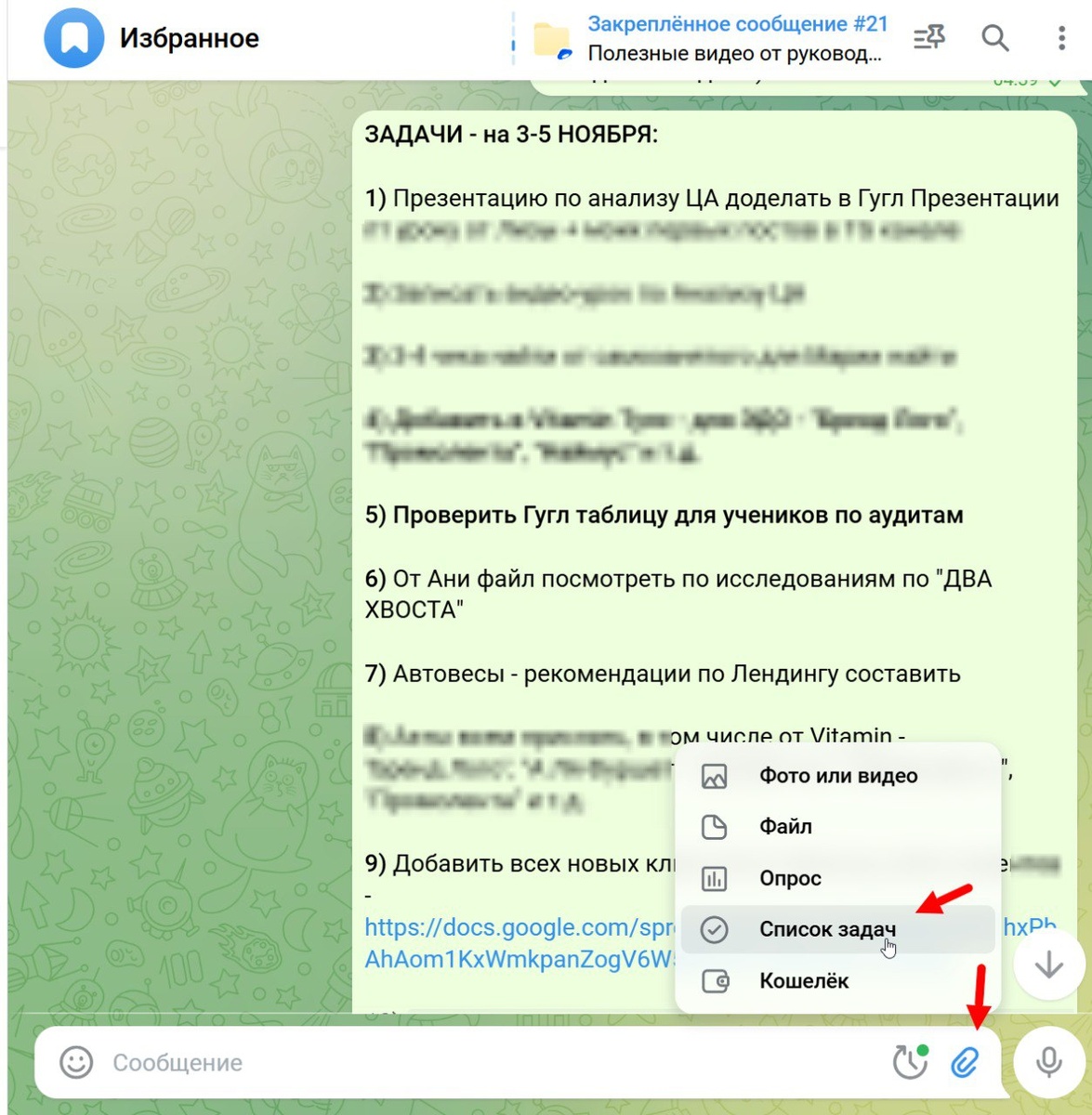 Для ведения списка рабочих и личных задач использую: Гугл Таблицу для задач на неделю и месяц + Список задач в TG - на каждый день Пишу задачи на каждый день себе в "Избранное" - это сообщение самому себе в Telegram ❓А Вы что используете, коллеги? Какие таск-менеджеры, сервисы-задачники, еженедельник быть может или тайм-трекер? Или AI-сервисы и нейросети?