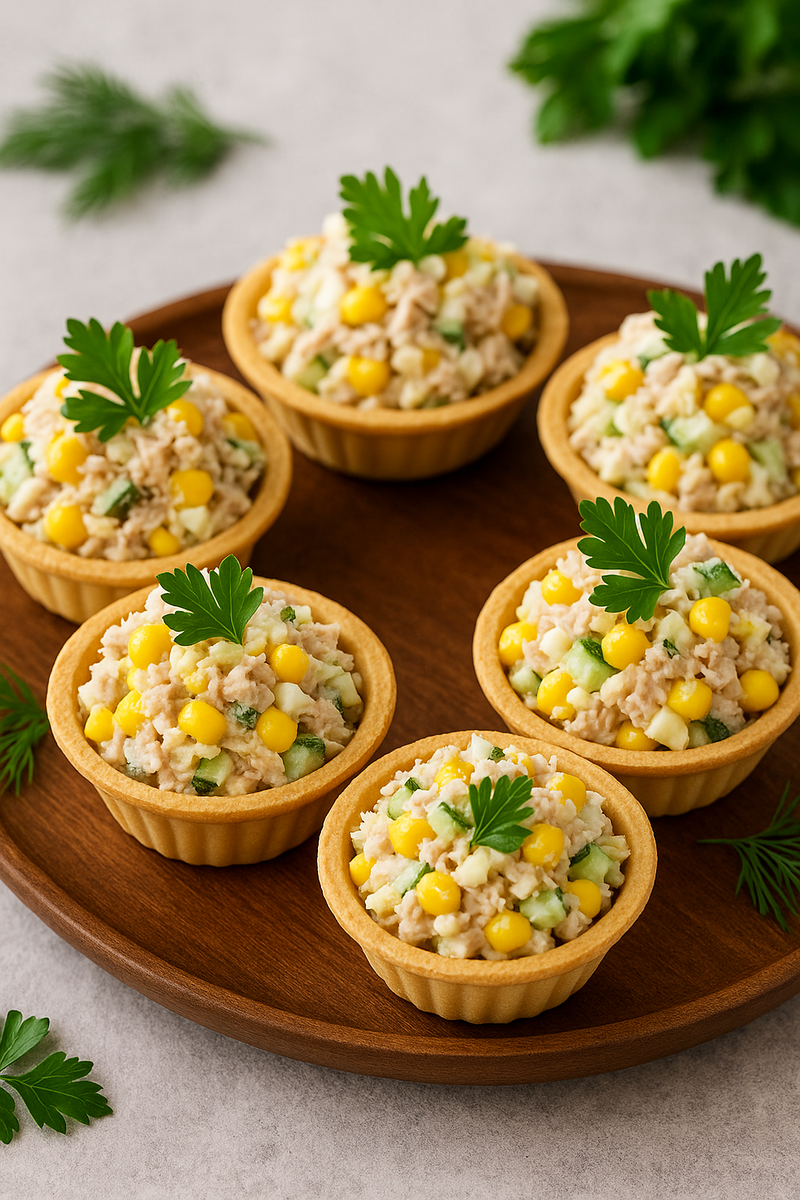 Нежный новогодний закусочный хит: как я готовлю салат с тунцом и кукурузой в тарталетках