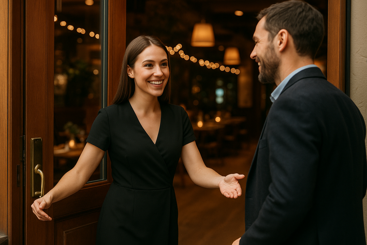 Встреча начинается до слов: я делаю шаг навстречу, ловлю взгляд и улыбаюсь — это базовый язык гостеприимства. Приветствие звучит первым: «Доброе утро/день/вечер» без роботизации и с живой интонацией. Далее — короткие уточнения: есть ли бронь и на сколько персон; если в листе брони пусто, лишних вопросов не задаю. Если нужна помощь с верхней одеждой, сопровождаю к гардеробу и возвращаю гостя к зоне посадки. Даю выбор минимум из двух столов и уточняю предпочтения по посадке — это уважение и микроконтроль впечатления. Иду рядом или на полшага впереди, выдерживаю темп, держу контакт глазами; меню не прижимаю к корпусу. Помогаю с посадкой, предлагаю подставку под сумку и вешалку — все вещи остаются в поле видимости гостя. Подаю меню правильно: основное — открытым и в руки, винную карту — закрытой; детям меню — в первую очередь. Коротко озвучиваю спецпредложения. Через 30 секунд после посадки у стола появляется официант — это дисциплина управления официантами, от которой прямо зависит продажи официантов в ресторане.