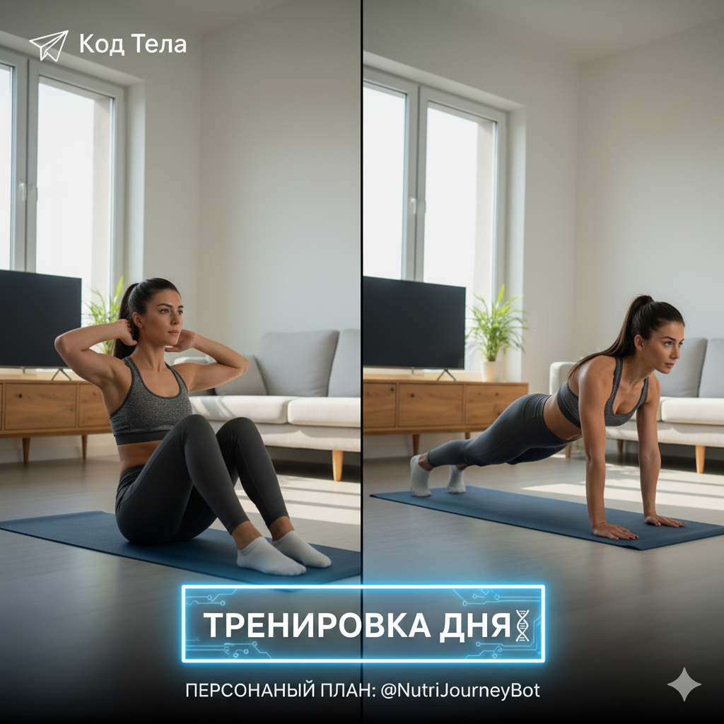 🧬 ТРЕНИРОВКА ДНЯ: Стальной пресс и круглые ягодицы за 15 минут дома! Сегодня работаем над самыми "горячими" зонами без инвентаря. Главное — техника и 🔥 жжение! 🔥 Разминка (2 минуты): Легкие прыжки, круговые движения бёдрами, наклоны. Основная часть (3 круга, отдых 60 секунд между кругами): 1. Ягодичный мостик: 15-20 повторений (Лягте на спину, согните ноги в коленях, стопы на полу. Поднимайте таз вверх, сжимая ягодицы в верхней точке). 2. Скручивания на пресс: 15-20 повторений (Лягте на спины, руки за головой. Поднимайте только плечи и верхнюю часть спины, прижимая поясницу к полу). 3. Приседания "Сумо": 15-20 повторений (Ноги шире плеч, носки врозь. Приседайте максимально низко, колени смотрят в стороны носков). 4. Планка: 30-45 секунд (Держите тело прямой линией от головы до пяток, пресс напряжен, ягодицы подтянуты). ⚡️ Не забудьте занести тренировку в свой дневник прогресса! А персональный план тренировок для ваших целей составит наш @NutriJourneyBot — п
