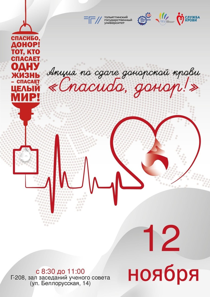 ❤️ Тот, кто спасает одну жизнь – спасает целый мир! В Тольяттинском госуниверситете состоится акция по сдаче донорской крови «Спасибо, донор!». К участию приглашаются все желающие в возрасте от 18 лет, не имеющие ограничений по состоянию здоровья. Доноры должны быть здоровыми, хорошо себя чувствовать, весить не менее 50 кг. Накануне сдачи крови нельзя принимать лекарства, за двое суток до сдачи запрещается пить алкоголь, за час нельзя курить. Так же необходим паспорт с пропиской в Самарской области. С полным списком противопоказаний к донорству, а так же с рекомендациями до и после донации можно ознакомиться на сайте. 📆 12 ноября ⏰ с 8:30 до 11:00 📍 Г-208 (ул. Белорусская, 14, зал заседаний Ученого совета) Всем сдавшим кровь донорам выплачивается денежная компенсация на питание, справка на 2 отгула в соответствии со ст. 186 ТК РФ. Минимальное время между донациями – 60 дней, то есть кровь сдавать можно раз в два месяца, но есть и ограничения: для женщин – 4 раза в год, для мужчин