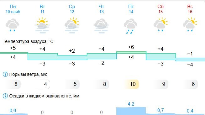В областном центре потеплеет до шести градусов со знаком «плюс» В Костроме на неделе с 10 по 16 ноября ожидается потепление. Об этом сообщают синоптики местного Гидрометцентра. Самые теплые дни ожидаются в областном центре в понедельник и пятницу. Днем температура воздуха поднимется до 5-6 градусов со знаком «плюс». Ночью она составит +4 градуса. 14 ноября ожидается также дождь и ветер с порывами до десяти метров в секунду. Самым холодным на неделе станет воскресенье. Температура воздуха днем опустится до -1 градуса, ночью — до четырех градусов со знаком «минус». Также ожидается мокрый снег. В остальные дни будет до 2-4 градусов тепла днем и до от двух до трех градусов со знаком «минус» ночью. Осадков в эти дни не ожидается.