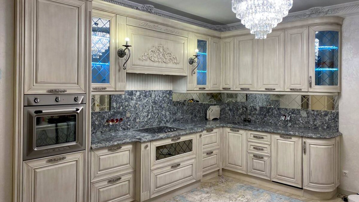 В этом проекте мебельная фабрика «Рондини» воплотила образ классической итальянской кухни - торжественной, изящной и невероятно уютной. Авторская коллекция кухни «Милан» в отделке винтаж стала олицетворением аристократического вкуса и мягкого романтизма. Каждая деталь этой композиции говорит о тонком чувстве меры и любви к итальянскому ремеслу. Светлые фасады с патиной и резными элементами создают ощущение лёгкости и благородства. Над варочной зоной - эффектная декоративная вставка с изящным орнаментом и гравировкой Bella casa, задающая настроение всему пространству. Контрастом и в то же время гармоничным акцентом выступает столешница и фартук из выразительного натурального камня глубокого серо-голубого оттенка с мраморным рисунком. Богатая текстура камня придаёт кухне индивидуальность и подчёркивает статус интерьера. Особое внимание заслуживает стекло - «Милан stopsol» с алмазной гравировкой. Оно отражает мягкое свечение внутренней подсветки, добавляя пространству мистической глубины