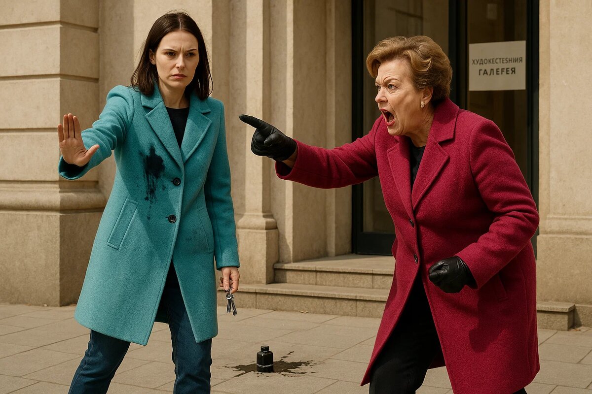 Виктория увернулась. Чернила разлетелись по её светлому пальто чёрными брызгами.