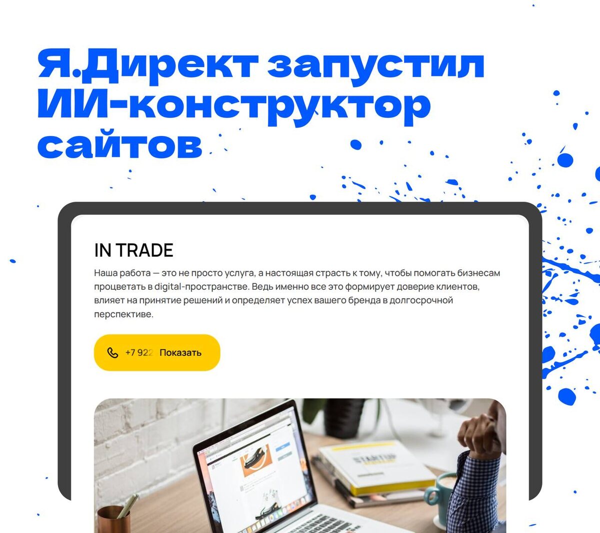 Яндекс.Директ запустил ИИ-конструктор сайтов 👨💻 Теперь лендинг можно собрать почти в один клик: – описываете свой бизнес, – выбираете или загружаете фото, – подключаете блоки: форма заявок, отзывы, карта, примеры работ. Нейросеть сама подкинет заголовки и тексты — удобно и быстро. Кому это зайдёт✔️ Начинающим мастерам, фрилансерам, тем, кто только выходит на рынок и хочет быстро рассказать о себе. Минимальный бюджет и вы уже онлайн ‼️НО чтобы обгонять конкурентов и реально усиливать продажи, нужен не просто лендинг, а сайт как полноценный маркетинговый инструмент: дизайн, анимация, аналитика, интеграции‼️ Мы в IN TRADE делаем именно такие проекты — продуманные, фирменные, с эффектом «вау», которые растут вместе с бизнесом и продают 24/7 😎 Готовы к следующему уровню? Напишите «сайт» — разберём, какой формат даст реальный буст↗️