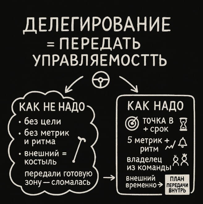 На прошлой неделе увидел ситуацию в одном из проектов, где запустили процесс передачи зоны новому внешнему эксперту, и сразу вспомнил свои неуспешные опыты делегирования. Первый большой и болезненный провал - когда я передал уже работающую зону новому человеку. Мне казалось, что он просто подхватит руль и поедет. В реальности зона начала сбоить. Я для себя нашел ответ такой - потому что человек не строил ее сам ❓ Не было базовых цифр, ритма, понятной карты процесса. Я ждал результата, а он ждал правил игры 🆘 Мой вывод - делегировать готовую зону без контура управления нельзя. Потом я попробовал делегировать создание новой зоны без целей. Типа специалист разберется и все настроит, он же специалист... Без конечной цели собственника, сроков и критериев готовности - это превратилось в долгую разведку. Сделали много действий, но мало движения к результату. Я понял, что без точки B любая передача полномочий превращается в угадайку 😩 Дальше я позвал внешнюю команду экспертов пост
