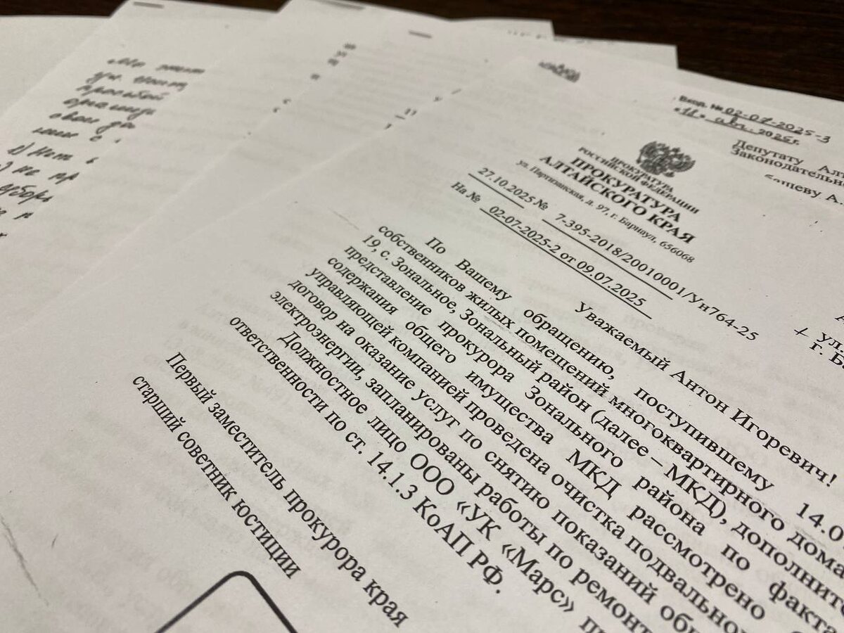Депутат фракции КПРФ в АКЗС Антон Арцибашев помог жителям села Зональное «приструнить» управляющую компанию, не исполнявшую свои обязанности по содержанию многоквартирного дома. Коллективное обращение от жителей дома по улице Центральная, 19 из села Зональное Зонального района поступило в июле 2025 года. Люди жаловались, что ООО « УК Марс» из города Бийска, управляющая их многоквартирным домом, совсем забросила свою работу и уже почти два года дом находится почти в бесхозном состоянии. В подъездах и у входа нет освещения, не производится ремонт, не убирается уличная территория, а в подъездах уборка лишь частичная. Кроме того, в доме захламлен подвал, там нет даже света, а «управляшка» даже о снятии показаний общедомовых приборов учета, что жители вынуждены делать самостоятельно. После запроса депутата прокуратурой Зонального района в августе была проведена проверка вместе с Инспекцией строительного и жилищного надзора Алтайского края. Выявлены нарушения Правил содержания общедомового