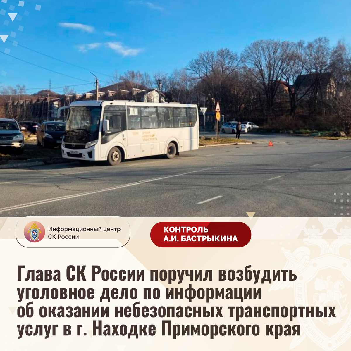 Глава СК России поручил возбудить уголовное дело по информации об оказании небезопасных транспортных услуг в г. Находке Приморского края В СМИ сообщается, что в ноябре текущего года в городе Находке Приморского края водитель маршрутного автобуса, осуществляя перевозку граждан, не справился с управлением и допустил съезд в ливневую трассу. В результате находившаяся в салоне двухлетняя девочка упала и получила травмы. Пострадавшей потребовалась медицинская помощь. В СУ СК России по Приморскому краю организована процессуальная проверка. Председатель Следственного комитета Российской Федерации Александр Иванович Бастрыкин поручил руководителю СУ СК России по Приморскому краю Эдуарду Анатольевичу Трубчику возбудить уголовное дело и доложить о предварительных и окончательных результатах его расследования. Исполнение поручения поставлено на контроль в центральном аппарате ведомства. #СледственныйКомитет #СКРоссии #СКР #ИЦСКР #Информационныйцентр #АлександрБастрыкин #ПредседательСКР #КонтрольП
