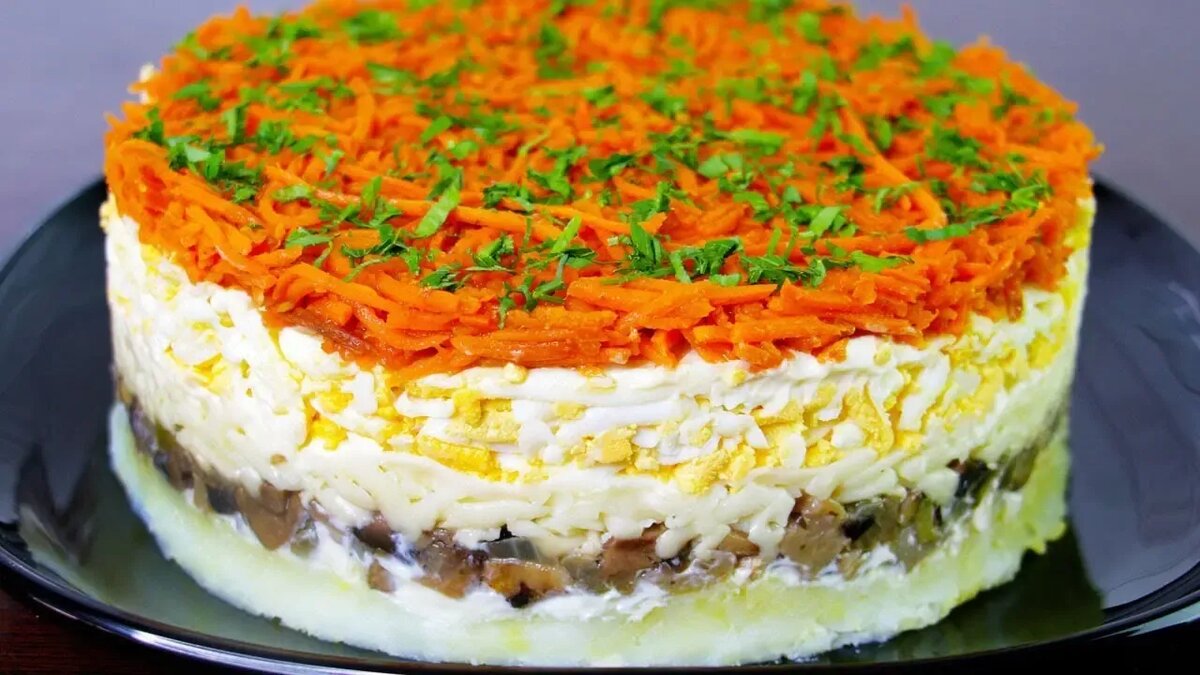 Салат необходимо собрать слоями. Первый слой сделайте из тертого картофеля. Второй слой сформируйте из грибов с луком. Третьим слоем идет натертый сыр, а четвертым — измельченные яйца. Верхний слой сделайте из моркови по-корейски.