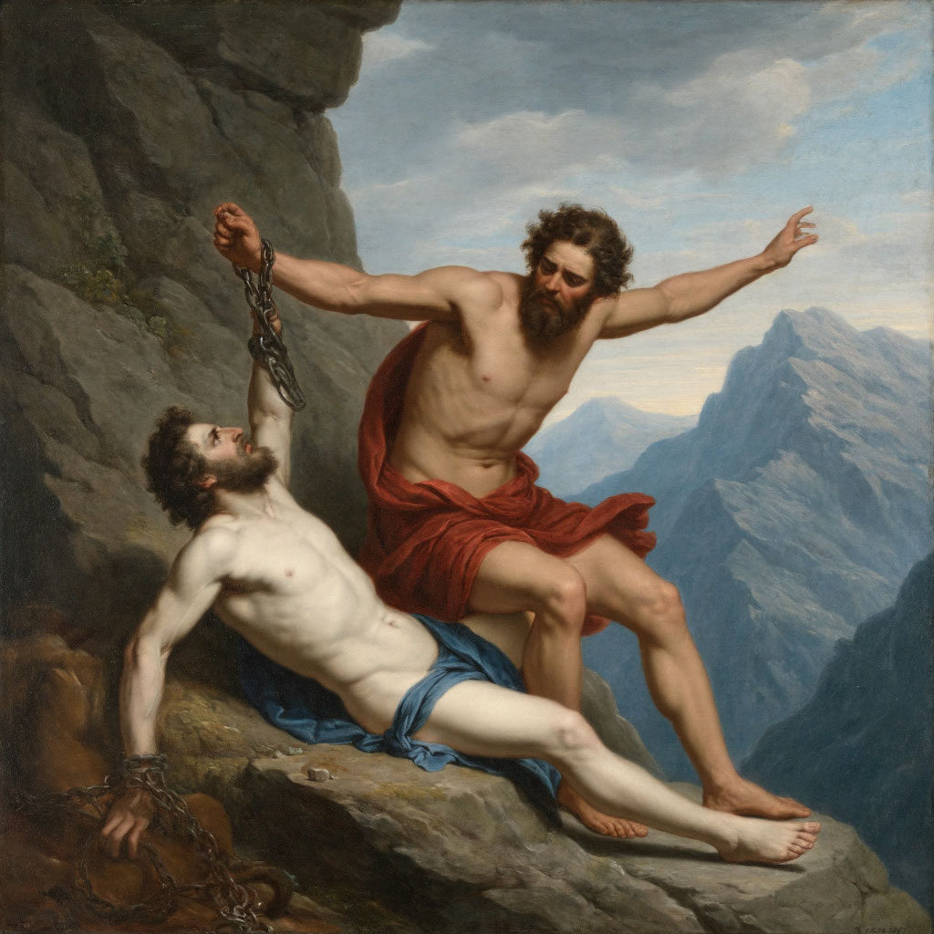 Прометей прикованный — это драма о бунте, жертве и пророческой мудрости. На отвесной скале у края света, где земля смыкается с бездной, прикован титан Прометей. Его руки скованы крепчайшими цепями, а тело прибито к скале громадным кованым гвоздём. Он один — среди ветров, пустынных просторов и немого неба. Но он не плачет. Он знает, за что наказан, и не сожалеет. Когда мир был юн, а люди — жалким племенем, блуждающим во тьме, Прометей украл огонь с Олимпа и принёс его смертным. Не просто искру — он передал людям знание: как строить дома, как лечить болезни, как читать звёзды, как вести счёт и варить металл. Он сделал их людьми. Но Зевс, верховный бог, воспылал гневом. Огонь — символ власти, тайна божества. Даровать его смертным — значит ослабить небесную власть. За это Зевс приговорил Прометея к вечной муке. Титан не сгибается. Он знает, что его страдания не напрасны. Он видит дальше, чем сам Зевс. В его уме — тайна, способная свергнуть владыку Олимпа. Но он хранит её молча, как клятву.