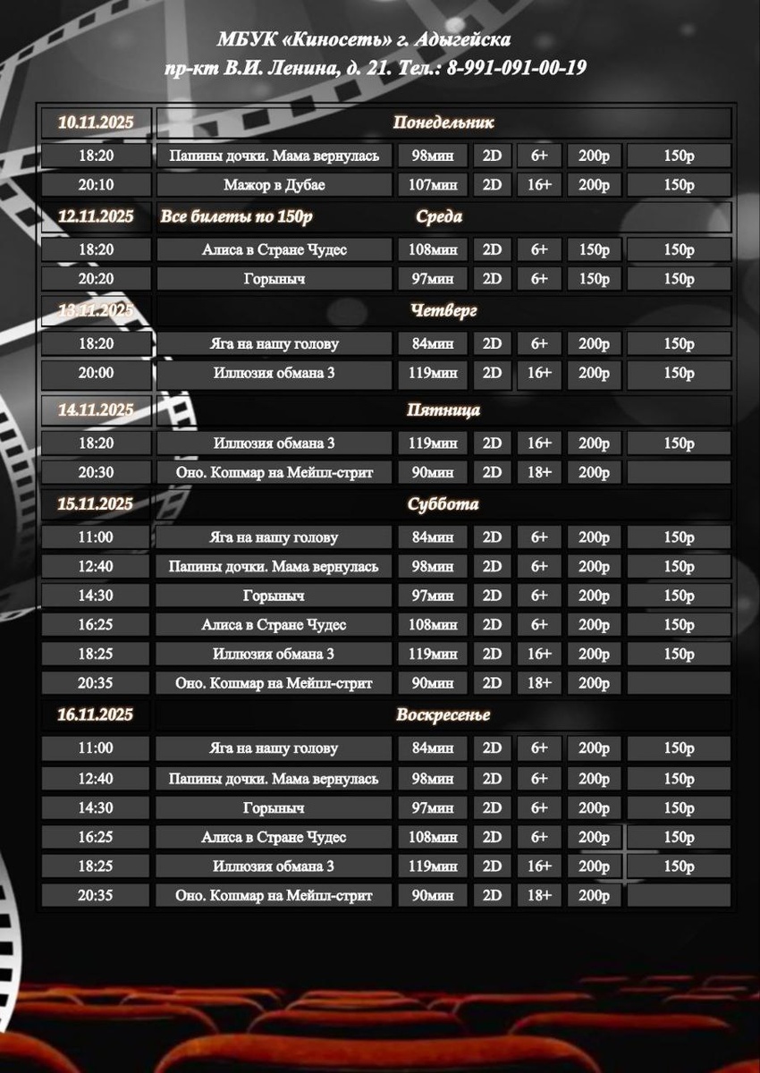 Расписание Кинозала г. Адыгейска с 10.11.2025 по 16.11.2025🎞 Купить билет онлайн можно по ссылке внизу 👇 https://clck.ru/32VTgE ___ Мы в социальных сетях👇 VK 🎞https://clck.ru/34TuU5 TG 🎞https://clck.ru/34TuU6 ОК 🎞https://clck.ru/3MdGRj 🎞WhatsApp: 8-991-091-00-19 📱8-991-091-00-19