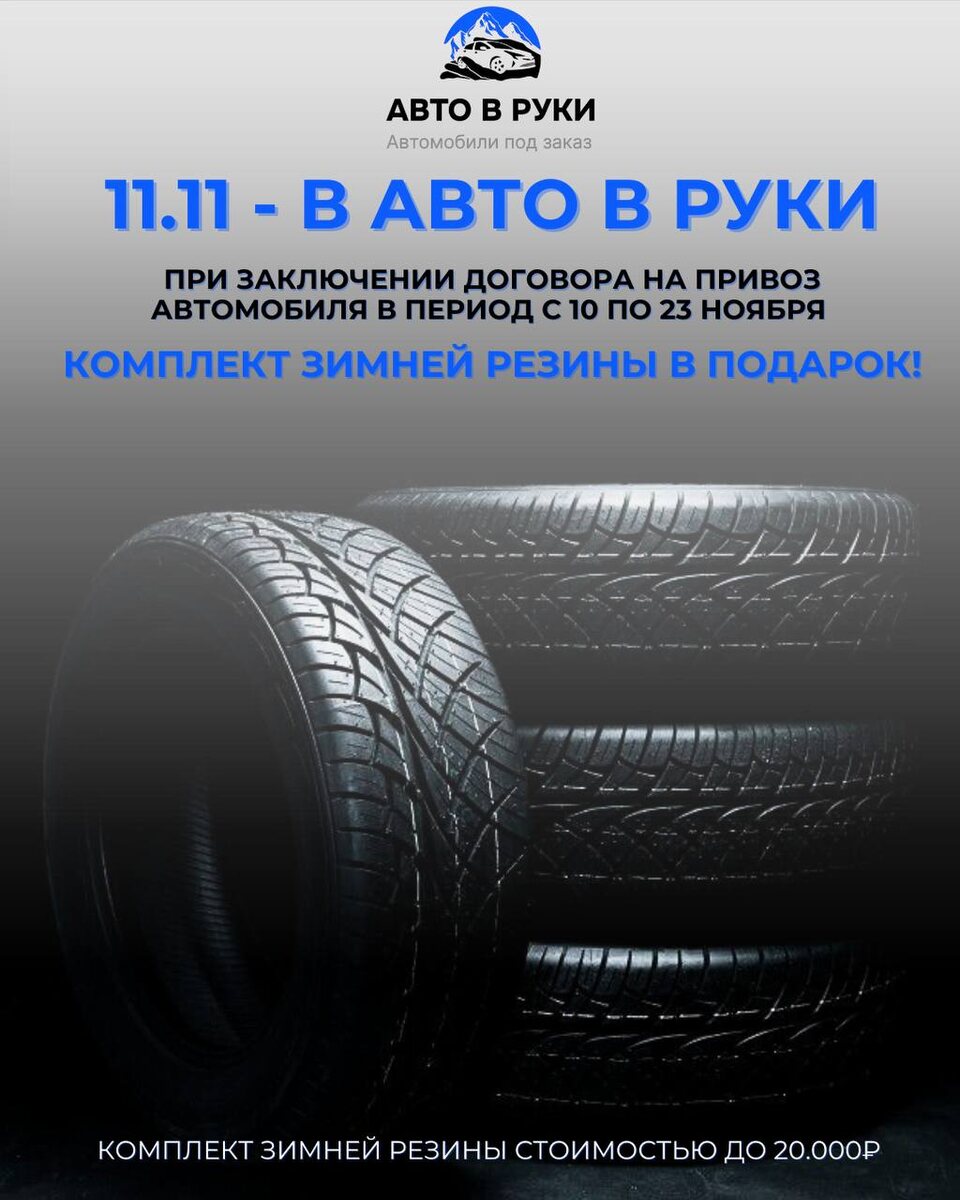 11.11: В «АВТО В РУКИ» НАСТУПАЕТ ВРЕМЯ ПОДАРКОВ! Внимание, автолюбители! Не пропустите самую горячую распродажу ноября в «Авто в Руки»! С 10 по 23 ноября (ровно 2 недели) Приобретая автомобиль в нашей компании в этот период, вы гарантированно получаете КОМПЛЕКТ ЗИМНЕЙ РЕЗИНЫ В ПОДАРОК🎁 Мы позаботились о вашей безопасности и комфорте на зимних дорогах. Что входит в подарок? • Комплект зимней резины Стоимостью до 20.000 рублей! • Специально подобранный для вашего нового автомобиля, чтобы вы чувствовали себя уверенно в любую погоду! Акция действует с 10 по 23 ноября! «Авто в Руки» - мы делаем ваши автомобильные мечты реальностью🚗💨