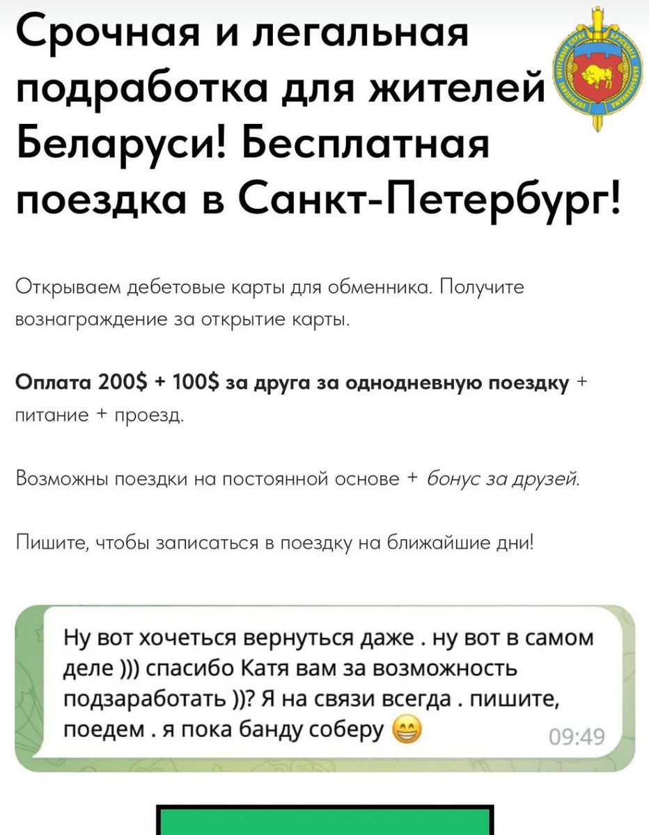 🗿 Вакансия «Оформитель карты на день» — одна ночь в Питере, а ответственность на всю жизнь! 🦇 Друзья, кратко и по-факту: в Telegram и соцсетях снова ходит «суперпредложение» — оплачиваемая однодневная поездка в Россию (Москва/Питер/Смоленск) с задачей «оформить карту для процессинга/крипто-арбитража». 🧐 Что происходит на самом деле: 😇 Вы едете, оформляете карту — и вам улыбаются. 😬 Карту используют киберпреступники для вывода чужих денег — а отвечать за операции придётся вам. 😶 Платят «за дорогу», но не платят за проблемы с законом. 🧐 Как не попасть на удочку (и не стать случайным фигурантом уголовного дела): 👎 Если обещают «быстрый заработок» за оформление карты — смело говорите «нет». 😠 Не давайте документы и не оформляйте карты по просьбе непонятных людей. 🤖 Подозрительное предложение — сохраняйте скрин, и поделитесь с близкими. 🫡 Если уже оформили карту и появились сомнения — свяжитесь с банком и правоохранителями.