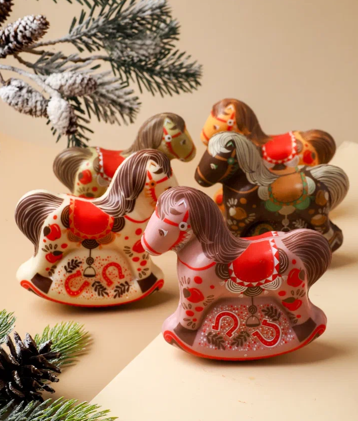 Помимо основных праздничных коллекций, «Конфаэль» традиционно готовит к каждому Новому году особую серию подарков, посвященную символу грядущего года. В 2026 году мы с гордостью представляем уникальную коллекцию символа года 2026 в стиле мезенской росписи, которое придает подаркам особую самобытность и культурную ценность.