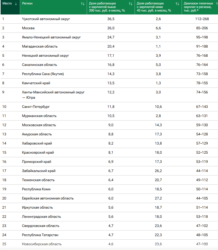23 место заняла Свердловская область в рейтинге российских регионов по уровню и распределению зарплат за восемь месяцев текущего года. Согласно исследованию «РИА Рейтинг», в пятерке лидеров традиционно оказались северные автономные округа: Чукотский (36,5%), Ямало-Ненецкий (24,7%), Ненецкий (17,1) и Магаданская область (20,4%). Второе место уверенно занимает Москва (26%). На фоне этих регионов Средний Урал выглядит скромно: доля населения, которое зарабатывает от 200 тыс. руб. в месяц — 4,7%, а доля работающих с зарплатой ниже 45 тыс. руб. в месяц составляет 23,6%. Диапазон типичных зарплат в Свердловской области составляет от 47 тыс. до 102 тыс. руб. Согласно исследованию, в среднем по России только 7,5% работников получают зарплату более 200 тыс. руб. в месяц. Ранее DK.RU писал о том, что в начале октября работодатели России готовы были платить новым сотрудникам в среднем 80 тыс. руб., а самые высокие зарплаты работодатели предлагают ИТ-специалистам — 250 тыс. руб., сварщикам — 207,1