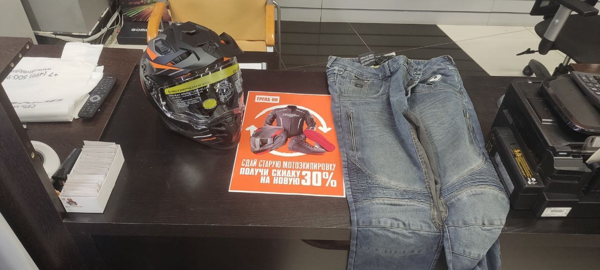 Трейд-ин в действии: Привозите в любой из розничных магазинов ДрайвБайк или отправляйте почтой старый мотошлем/мотокуртку/мотоштаны/мотокомбез/мотоботы и получайте новый мотошлем, мотокуртку, мотоштаны, мотоботы или комбез со скидкой 30%!* Участвует ВСЯ РОССИЯ! Для получения скидки достаточно прислать нам фото квитанции отправления!** *, **Подробная информация на сайте - тут