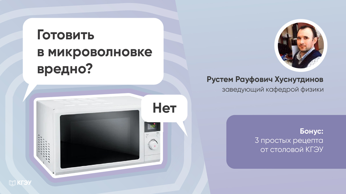 Микроволновка давно стала неотъемлемой частью кухни, но споры вокруг неё не утихают. Кто-то уверен, что излучение разрушает витамины, кто-то — что «меняет структуру пищи». Чтобы разобраться, мы обратились к заведующему кафедрой физики Казанского государственного энергетического университета Рустему Хуснутдинову. Вредно ли ежедневно готовить и разогревать еду в микроволновке? Нет, не вредно. Микроволны — это неионизирующее электромагнитное излучение с частотой 2,45 ГГц (примерно 12 см длиной волны). Оно не изменяет химический состав продуктов и не делает их опасными. На этой частоте волна особенно хорошо взаимодействует с молекулами воды, заставляя их колебаться и тем самым нагревать еду изнутри. Именно поэтому микроволновка так быстро справляется с разогревом. Почему еда иногда прогревается неравномерно? Это связано с физикой процесса. Внутри печи формируются стоячие волны — зоны с разной интенсивностью излучения. В одних местах тепло концентрируется, в других — слабее. Чтобы компен