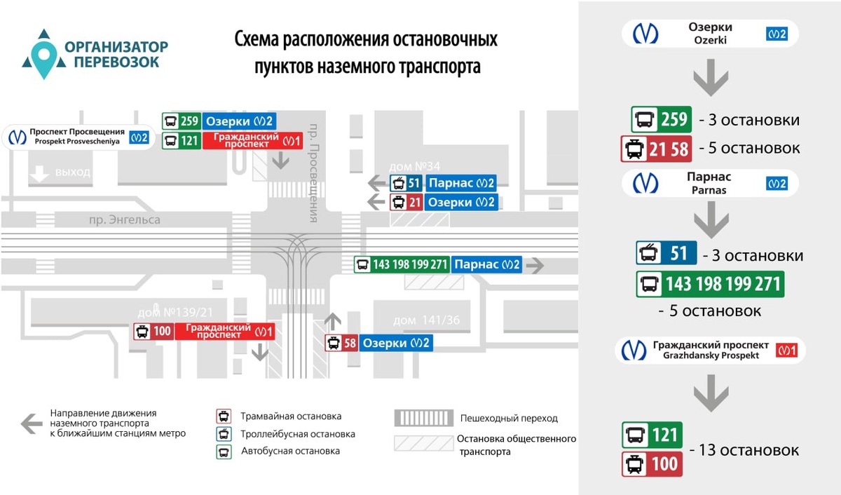 Из-за временного закрытия на вход станций метро «Озерки» и «Проспект Просвещения» СПб ГКУ «Организатор перевозок» рекомендует пользоваться