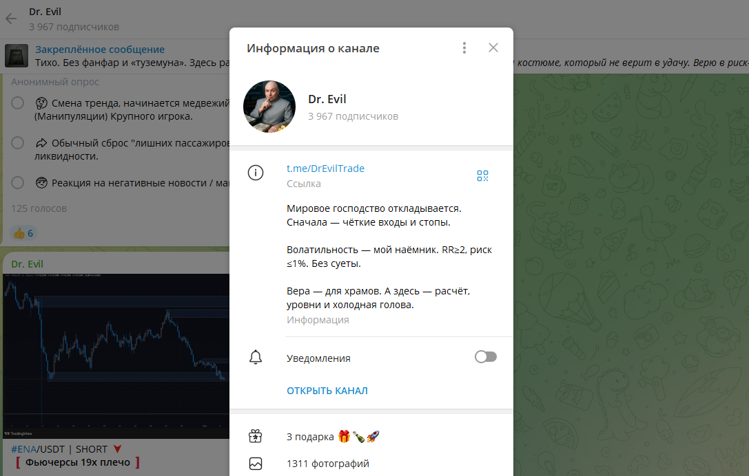Сегодняшний разбор трейдинг канала Dr. Evil в Телеграмм определит, стоит ли вкладываться в сигналы и стоит ли доверять информации, публикуемой в ленте.