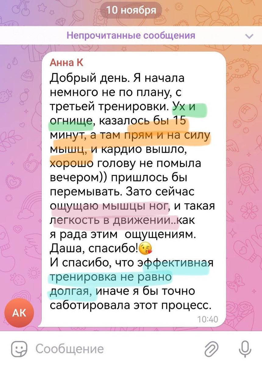 Не успела я выложить, кто-то уже попробовал, и пишет об одной из тренировок: 15 минут, а такие приятные ощущения. И самое главное: эффективная ≠ долгая, иначе начинается саботаж. По себе знаю: вижу тренировку на 57:49 - не буду делать. Вижу на 20-30 минут - а почему бы и нет? У нас в клубе тренировки можно даже не заканчивать - эффект бывает даже от одного круга в 5 минут. Обещаю. Зайти к нам в ➡КЛУБ - ТУТ ❤ .
