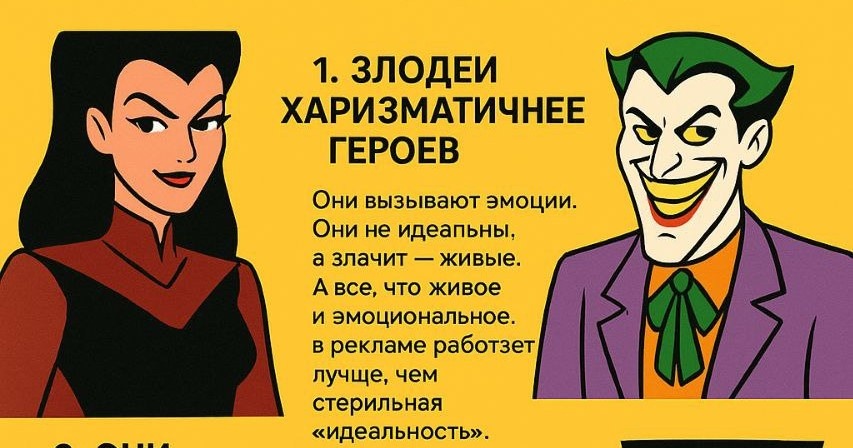 Когда мы говорим о персонажах в рекламе, все сразу представляют улыбчивых, добрых, милых героев. Но вот вопрос: А что, если бренду нужен не герой, а злодей? Да-да, тот самый хитрый, саркастичный и харизматичный персонаж, который не просто «хороший», но интересный. В ВА Групп мы уверены: Иногда именно «плохие парни» делают рекламу незабываемой. И вот почему. 👇 💀 1. Злодеи харизматичнее героев: Давайте честно — кто запомнился вам сильнее? Шрам или Симба? Малефисента или Спящая красавица? Джокер или Бэтмен? Правильно. Злодеи. Они вызывают эмоции. Они не идеальны, а значит — живые. А всё, что живое и эмоциональное, в рекламе работает лучше, чем стерильная «идеальность». 😈 2. Они помогают бренду выделиться: Добрых персонажей — миллион. Все они улыбаются, обнимаются, заботятся. А вот злодей на плакате с фразой: «Мы не злые. Мы просто делаем быстро и без лишних слов.» — привлечёт внимание гораздо сильнее. Иногда «тёмная» энергия помогает бренду показать уверенность, силу и характер. И это