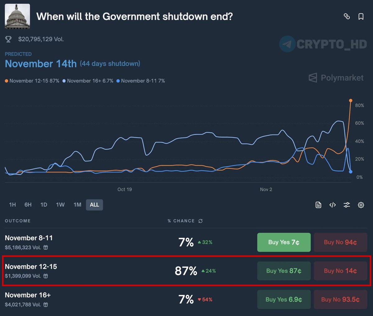 🇺🇸 Приостановка работы правительства США может завершиться уже 12-15 ноября с вероятностью 87% (исходя из ставок на Polymarket) Ранее: - первый шаг к завершению - на финишной прямой Crypto Headlines