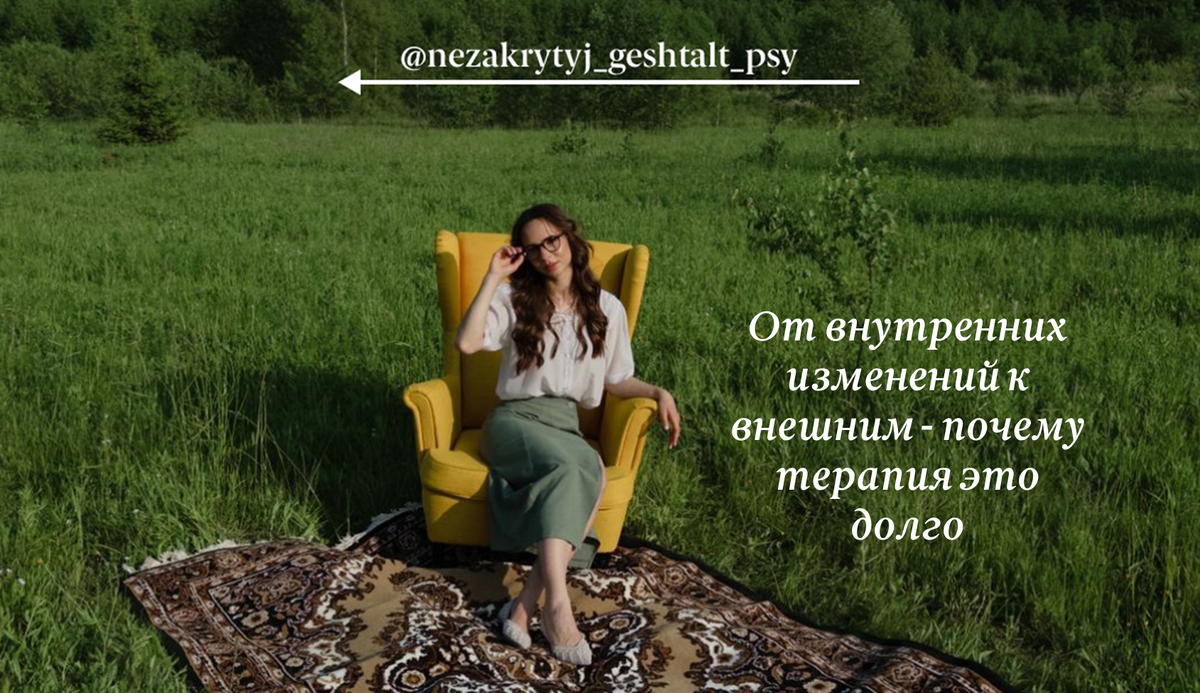 Многие люди после терапии замечают, что они изменились. И окружение этих людей замечает изменения. "Ты изменился!" - говорят окружающие. "Да, в этом и была вся суть" - говорит человек, улыбаясь. Смысл ходить годами или даже месяцами к психологу, если ничего не меняется - не понятно. Изменения сначала происходят внутри личности. Да, сначала разворачивается процесс переоценки ценностей, себя, отношений, своих выборов и способов жить свою жизнь... внутри. Человек это может даже ни с кем не обсуждать. Он будет просто глубоко внутри себя переосмысливать. При этом внешне он может вообще не поменяться - он может состоять в тех же отношениях, ходить на ту же работу, хоть на те же тусовки или выбирать тот же досуг. Сначала у него будет то же окружение. И только после изменения сознания, внутреннего мироустройства, человек начинает менять, преобразовывать реальность вокруг себя. Это вовсе не значит, что он обязательно разрушит все свои старые отношения, уволится "вникуда", потеряет весь свой пе