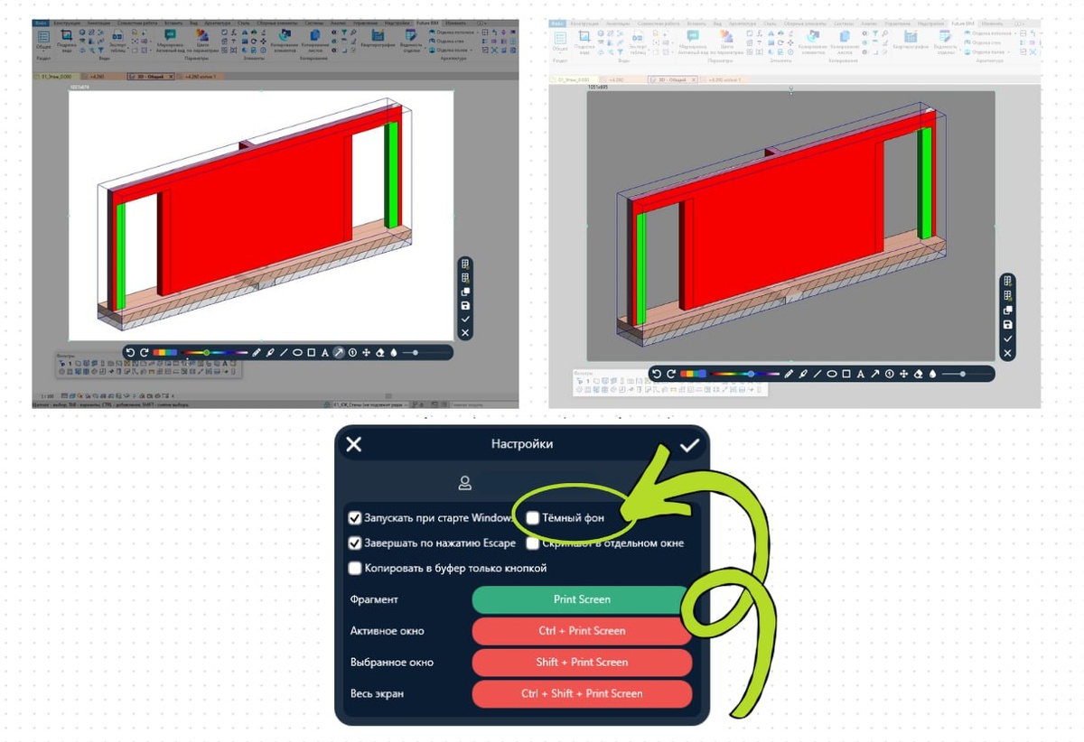 🌗 Светлая или тёмная? А ты на какой стороне?😇😈 Когда делаешь скрин, важно сразу увидеть, где "твой кадр",а где просто фон, который мешает фокусироваться 👀 В Future Cap есть два режима выделения области скрина — светлый и тёмный. Они помогают чётко отделить нужный фрагмент от остального экрана. 🌞Светлый фон Пространство вокруг будущего скрина осветляется. Удобно, если работаешь в тёмной программе. Например, в Revit с 🌌 темой. 🌚 Тёмный фон Наоборот, затемняет всё за пределами выделения. Подходит, если у тебя светлая рабочая среда: глаза меньше устают, и контраст выше. Или просто выбирай что больше нравится😊 Переключить тему можно в Настройках. Ищи иконку Future Cap в трее Windows, далее нажми Настройки😉