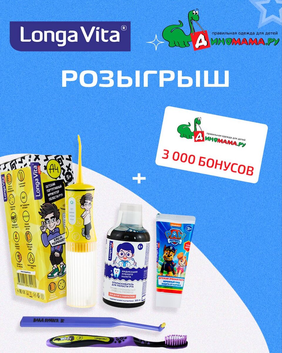 ❌❌❌СТОП❌❌❌Всем привет, дорогие наши давно не было розыгрышей с призами, исправляемся🤗🏆👌 Мы хотим, чтобы в вашем доме всегда было радостно! LONGA VITA заботится о здоровье полости вашего рта, а Диномама.ру о том, чтобы вашим детям было комфортно на улице в любую погоду. Сегодня мы объединились, чтобы подарить вам классные призы! 🏆ПРИЗЫ Диномама.ру - одежда и обувь для детей ▪️3000 бонусов = 3000 рублей на покупку в интернет магазине dinomama.ru LONGA VITA ▪️Набор продукции по уходу за зубами КАК УЧАСТВОВАТЬ? 1️⃣ Подпишитесь на оба канала: 👉Диномама.ру 👉Longa Vita 2️⃣ Поставьте реакцию на этот пост ❤️ 3️⃣ Напишите «Участвую» под постом ВАЖНО ✔️Розыгрыш проводится с 10 по 20 ноября 2025г. ✔️20 ноября в 11:00 (по МСК) с помощью рандомайзера определим 2 (двух) победителей в каждом аккаунте Участвуйте и получайте подарки! 🍀